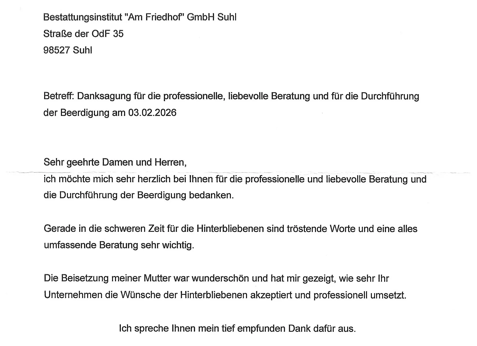 Als Schwiegertochter von (…) möchte ich mich im Namen der gesamten Familie ganz herzlich bei Ihnen und Ihrem Team für die wunderbare und sehr würdevolle Ausgestaltung der Trauerfeier und der Urnenbeisetzung bedanken.
